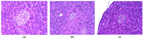 Micrographs of histological preparations of the pancreas in different experimental groups at 600× magnification: (a) healthy; (b) untreated; (c) treated with TS. Hematoxylin-eosin.