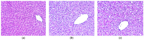 Micrographs of histological preparations of the liver in different experimental groups at 600× magnification: (a) healthy; (b) untreated; (c) treated with TS. Hematoxylin-eosin.