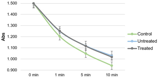 The absorbance loss (∆Abs) at 730 nm was calculated to compare the antioxidant capacity of the samples considering the initial absorbance Ainitial, the absorbance after 10 min of incubation A10min, and the decrease due to the self-bleaching ∆Aself-bleaching, as follows (Formula (2)):