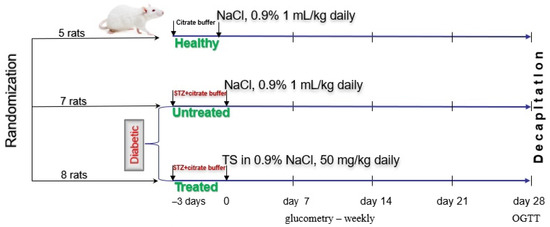 Rats (n = 20) were randomized into three groups (Figure 7). The healthy group (n = 5) on the 1st day of the experiment was treated with citrate buffer via a single intraperitoneal injection, and during the next 28 days SS in a volume of 1 mL/kg/day was administrated orally. Diabetic rats of the untreated group (n = 7) on the 1st day of the experiment were injected with STZ 45 mg/kg, and during the next 28 days SS in a volume of 1 mL/kg/day was administrated orally. Diabetic rats of the treated with TS group (n = 8) on the 1st day of the experiment were injected with STZ 45 mg/kg, and during the next 28 days TS suspension in SS was administrated orally in a dose of 50 mg/kg.