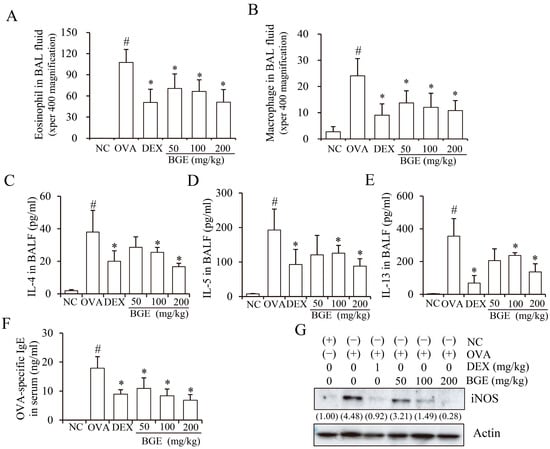 Effects of black ginseng extract (BGE) on allergic airway inflammatory responses in ovalbumin (OVA)-sensitized mice with allergic airway inflammation. (A,B) The number of immune cells (eosinophils/macrophages) in bronchoalveolar lavage fluid (BALF) was determined using cell counting. (C–F) The secretion levels of interleukin-4 (C), -5 (D), and -13 (E) in bronchoalveolar lavage fluid, and the production of serum immunoglobulin E (F) in OVA-sensitized mice with allergic airway inflammation, as determined using an enzyme-linked immunosorbent assay. (G) The expression of inducible nitric oxide synthase (iNOS) in lung tissue lysates, detected using Western blot analysis with antibodies against iNOS and β-actin as a loading control. The numbers underneath the bands indicate the relative band intensity (fold change relative to control). Dexamethasone (DEX) was used as a positive control. NC: normal control; OVA: ovalbumin-sensitized; DEX: 1 mg/kg DEX-treated OVA mice; BGE 50: 50 mg/kg BGE-treated OVA mice; BGE 100: 100 mg/kg BGE-treated OVA mice; and BGE 200: 200 mg/kg BGE-treated OVA mice. The values are expressed as mean ± standard deviation (n = 6). # p < 0.01: significantly different compared with the NC; * p < 0.05: significantly different compared with the OVA-induced group.