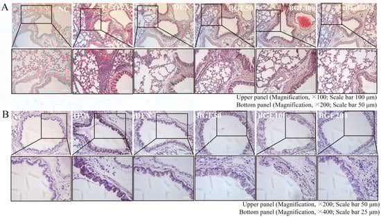 Six-week-old female BALB/c mice (weighing approximately 18 g) were purchased from Koatech Co. (Pyeongtaek, Republic of Korea) and acclimated to the environment for one week before the experiment. The mice were randomly classified into the following six treatment groups (n = 6 per group): (i) normal control (NC); (ii) OVA (OVA and alum-sensitized mice); (iii) DEX (OVA + 1 mg/kg dexamethasone); (iv) BGE 50 (OVA + 50 mg/kg BGE); (v) BGE 100 (OVA + 100 mg/kg BGE); and vi) BGE 200 (OVA + 200 mg/kg BGE). To induce airway inflammation to mimic allergic asthma, the mice were exposed to OVA sensitization and inhalation, as previously described [52]. Briefly, mice were administered a mixture of OVA and alum (day 0: 30 μg OVA and 3 mg alum; day 7: 60 μg OVA and 3 mg alum). On days 11–13, mice were administered OVA through inhalation daily for 1 h. On days 9–13, mice were orally administered BGE or dexamethasone (DEX); treatment with 1 mg/kg of DEX is widely used as a positive control for asthma treatment [53,54,55].