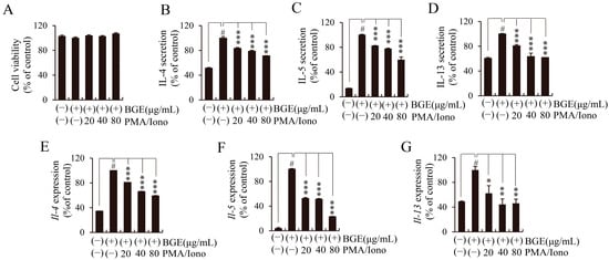 To study the T-cell activation-related cytokine expression changes after BGE treatment, we used a model system in which mouse EL4 cells were stimulated with PMA and Iono (PMA/Iono). The EL4 cells were treated with BGE at concentrations of 20, 40, and 80 μg/mL for 24 h, and cell viability was tested using a CCK-8 assay. No significant decrease in cell viability was observed after BGE treatment up to a concentration of 80 μg/mL (Figure 4A). Aberrant Th2-mediated asthma is associated with Th2 cytokines such as IL-4, -5, and -13. Expectedly, PMA/Iono potently induced IL-4, -5, and -13 expression in EL4 cells, whereas BGE dose-dependently inhibited the secretion of IL-4, -5, and -13, as measured by an enzyme-linked immunosorbent assay (ELISA) (Figure 4B–D). To determine whether BGE could regulate the expression of these cytokines at the transcriptional level, we investigated the effect of BGE on Il-4, -5, and -13 mRNA expression using qRT-PCR in PMA/Iono-stimulated EL4 cells. Consistent with the ELISA results, BGE significantly inhibited the mRNA expression of PMA/Iono-induced Il-4, -5, and -13 in a concentration-dependent manner (Figure 4E–G). These results demonstrated that BGE could regulate the expression of Th2 cytokines by suppressing both transcriptional and translational expression levels in PMA/Iono-stimulated EL4 cells.