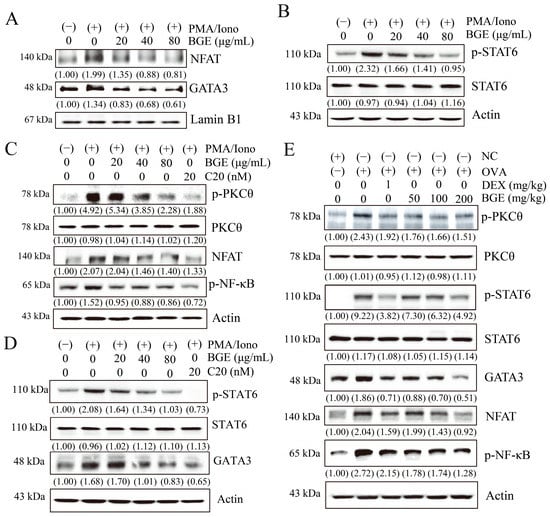 Since PKCθ is necessary for efficient activation of transcription factors such as NFAT, NF-κB, GATA3, and STAT6 during allergic asthma reactions [22,23,31], we investigated whether BGE or C20 (a specific PKCθ inhibitor) could inhibit the activation of PKCθ and asthma-associated transcription factors in PMA/Iono-stimulated EL4 cells. Western blot analysis was performed using targeted antibodies for p-PKCθ, PKCθ, NFAT, p-NF-κB, p-STAT6, STAT6, and GATA3. As shown in Figure 5C, PMA/Iono exposure for 30 min increased activation of PKCθ, NFAT, and NF-κB; however, BGE or C20 considerably inhibited these activities in a dose-dependent manner without changing total PKCθ expression (Figure 5C). Moreover, BGE or C20 inhibited STAT6 phosphorylation and GATA3 expression without altering the total STAT6 expression in EL4 cells treated with PMA/Iono for 24 h (Figure 5D). In the lung tissues of OVA-induced allergic airway inflammation, PKCθ, STAT6, and NF-κB phosphorylation and GATA3 and NFAT expression levels were increased but were effectively inhibited by BGE without changing the total PKCθ and STAT6 expression (Figure 5E). The positive control, DEX, also showed a similar inhibitory effect. Overall, our results found that BGE inhibits allergic airway inflammation by negatively regulating the activation of PKCθ and asthma-related transcription factors (NFAT, NF-κB, GATA3, and STAT6) in mice with allergic airway inflammation as well as in EL4 cells.
