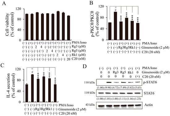 We investigated whether each of the three major ginsenosides (Rg3, Rg5, and Rk1) isolated from BGE had a suppressive effect on IL-4 expression via the phosphorylation of signaling molecules such as PKCθ and STAT6. A specific PKCθ inhibitor, C20, was also included in the experiment. The results of the cell viability assay showed that none of the compounds had any cytotoxicity at the corresponding concentrations in EL4 cells (Figure 6A). Pretreatment with each of the three ginsenosides and C20 significantly inhibited PKCθ (Thr538) phosphorylation (Figure 6B). Expectedly, the three ginsenosides and C20 inhibited PMA/Iono-induced IL-4 expression (Figure 6C) and decreased STAT6 phosphorylation without affecting total STAT6 expression (Figure 6D). These results demonstrate that the three ginsenosides inhibited IL-4/STAT6 signal activation by suppressing the phosphorylation of PKCθ, similar to the mode of action of C20, in PMA/Iono-induced EL4 cells.