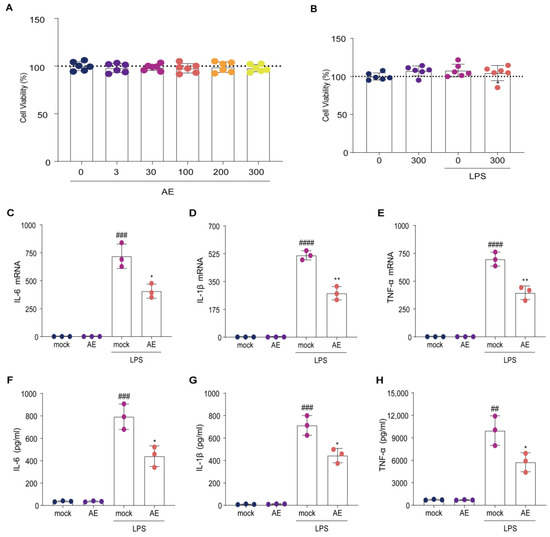 We examined the anti-inflammatory effects of AE through in vitro experimentation utilizing murine macrophages (RAW 264.7) procured from the American Type Culture Collection (Manassas, VA, USA). The cells were subjected to culture in Dulbecco’s modified Eagle’s medium (Gibco, Grand Island, NY, USA), supplemented with 10% (v/v) fetal bovine serum and 1% (v/v) penicillin/streptomycin (Gibco) and maintained in a 5% CO2 incubator at 37 °C.