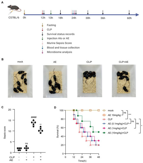 Therapeutic effect of AE in mice with CLP-induced sepsis. (A) Experimental design. (B) Typical behavioral changes in mice with CLP-induced sepsis after 12 h of AE (10 mg/kg) treatment. (C) The murine sepsis score (MSS) in mice with CLP-induced sepsis after 12 h of AE (10 mg/kg) treatment (n = 6); ANOVA and Tukey’s post hoc test were used to analyze the data. #### p < 0.0001 vs. the control group; ** p < 0.01 vs. the LPS group. (D) Effect of AE on the survival of septic mice (n = 20). Data were statistically analyzed using the Mantel–Cox test; * p < 0.05 and *** p < 0.001; ns, not significant. Sample sizes are indicated in brackets.