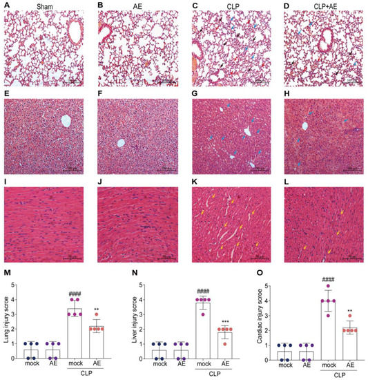 AE’s protective effects against lung, liver, and heart tissue lesions in mice with CLP-induced sepsis. Representative microscopic images of hematoxylin and eosin (H&E) staining of (A–D) lung, (E–H) liver, and (I–L) heart tissue from mice with CLP-induced sepsis (magnification, 200×). Tissue injury is indicated by pulmonary edema (red arrow), inflammatory cell infiltration (blue arrow), alveolar wall thickening (black arrow), and cardiomyocyte rupture (yellow arrow). Pathological scores of (M) lung, (N) liver, and (O) heart tissues of mice with CLP-induced sepsis. Data are expressed as mean ± standard deviation. #### p < 0.0001 vs. the control group; ** p < 0.01 and *** p < 0.001 vs. the CLP group. Scale bars = 50 μm. The experiments were repeated three times.