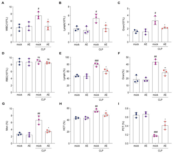 Changes in hematology parameters following AE treatment in mice with CLP-induced sepsis. Count of (A) white blood cells (WBC), (B) lymphocytes (LymPh), (C) granulocytes (Gran), and (D) red blood cell (RBC) count and percentage of (E) LymPh, (F) Gran, and (G) monocytes (Mon), (H) hematocrit (HCT), and (I) platelet crit (PCT) in peripheral blood were analyzed at 12 h after AE treatment in mice with CLP-induced sepsis. ANOVA and Tukey’s post hoc test were performed to analyze the data. # p < 0.05, ## p < 0.01, and ### p < 0.001 vs. the control group. * p < 0.05 and ** p < 0.01 vs. the CLP group; ns, not significant. The experiments were repeated three times.