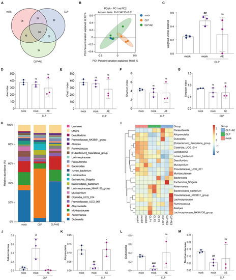 AE restores intestinal microbiota homeostasis in mice with CLP-induced sepsis. (A) Operational taxonomic units (OTUs) of intestinal microbes are shown in a Venn diagram. (B,C) Microbiota diversity analysis at the OTU level of the intestinal microbiota. (B) Diverse groups of UniFrac Adonis PCoA plots for beta diversity. (C) Weighed UniFrac ANOSIM analysis of beta diversity in distinct populations. (D–G) OTU-level analysis of intestinal microbiota alpha diversity. (D) ACE index; (E) Chao1 index; (F) Shannon index; (G) Simpson index. (H) Genus-level composition of gut microbiota. (I) Intestinal microorganisms in distinct groups at the genus level are represented by heat maps. Relative abundance of (J) Akkermansia, (K) Dubosiella, (L) Muribaculaceae, (M) Prevotellaceae_UCG_001. Based on the standardization of the relative abundance of species in each row, the heat map’s Z-value was obtained. ANOVA and Tukey’s post hoc test were performed to analyze the data. # p < 0.05, ## p < 0.01, and ### p < 0.001 vs. the control group. * p < 0.05 vs. the CLP group; ns, not significant. The experiments were repeated three times.