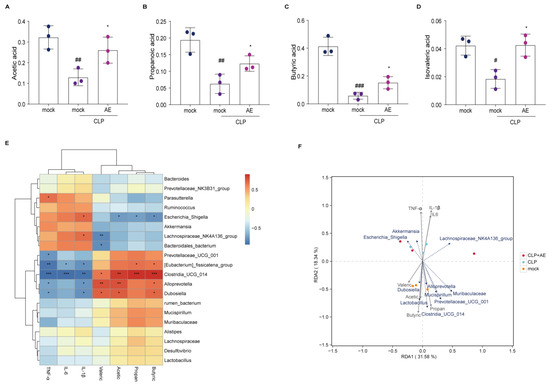 Association between intestinal flora and environmental factors in mice with CLP-induced sepsis following AE treatment. Effects of AE on the levels of short-chain fatty acids (SCFAs): (A) acetic, (B) propionic, (C) butyric, and (D) isovaleric acids produced by intestinal microorganisms in CLP-induced septic mice (n = 3). (E) Spearman’s rank correlation heat map among bacterial genera, levels of SCFAs, IL-6, IL-1β, and TNF-α in the serum of mice with CLP-induced sepsis. (F) Redundancy analysis/canonical correspondence analysis between the bacterial genera and SCFA levels in mice with CLP-induced sepsis. Data are expressed as mean ± standard deviation. ANOVA and Tukey’s post hoc tests were performed to analyze the data. # p < 0.05, ## p < 0.01, and ### p < 0.001 vs. the control group. * p < 0.05 vs. the CLP group. The experiments were repeated three times.