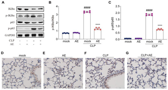 Effect of AE treatment on NF-κB signaling in mice with CLP-induced sepsis. (A) Western blot analyses showing the protein expression levels of p-IκBα and p-NF-κB (p-p65) in lung homogenates after 12 h of AE treatment. (B,C) Image J was used for densitometric analysis of the relevant bands. (D–G) Immunohistochemistry analysis of lung tissues showing the expression of p-NF-κB (p-p65). Scale bar = 50 μm. ANOVA and Tukey’s post hoc test were performed to analyze the data. #### p < 0.0001 vs. the control group. **** p < 0.0001 vs. the CLP group. The experiments were repeated three times.