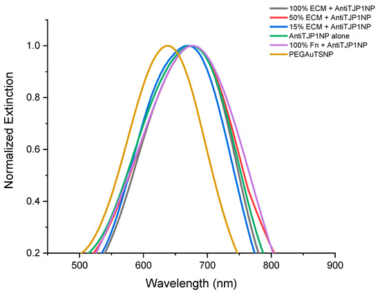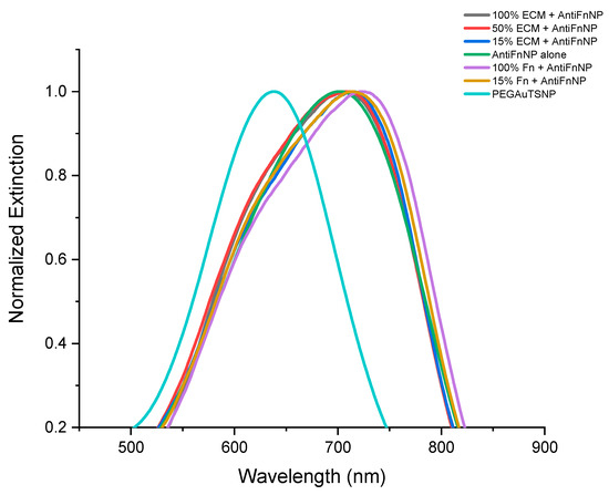 The sensitivity of Fn antibody-functionalized nanoparticles to detect their corresponding antigen within its native environment was tested. Anti-Fn-PEGAuTSNPs were exposed to different concentrations of cell-extracted extracellular matrix (ECM) as a complex and native environment for Fn. As presented in Figure 1 and Table 1, according to Localized Surface Plasmon Resonance analysis (LSPR), PEGAuTSNPs’ λmax was recorded at 638 nm, and upon functionalization with anti-Fn, a shift of 65 nm was observed, indicating the successful coating of the nanoplates with the antibody. Following this, the functionalized nanoplates were exposed to different concentrations of cell-isolated ECM and analyzed, showing a shifting profile, different than expected, with longer shifts recorded for the less concentrated ECM samples.