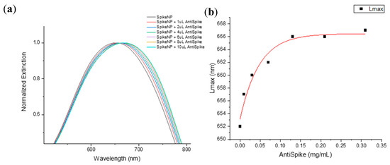 (a) LSPR spectra of Spike PEG-AuTSNP with increasing amounts of anti-Spike; (b) LSPR peak shift as a function of anti-Spike concentration for Spike PEG-AuTSNPs.