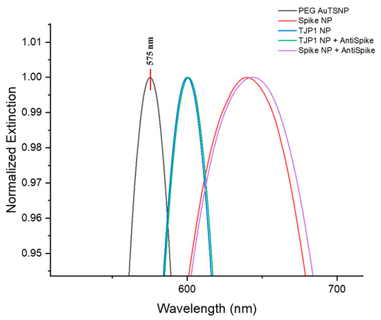 The specificity of the Spike–anti-Spike system was tested with the previously established concentrations of Spike-PEGAuTSNPs and anti-Spike as per detection curves (Figure 3). The TJP1 protein was used as a negative control for binding since the anti-Spike antibody is specific to Spike protein according to the manufacturer’s information [24]. The amount of used TJP1 was equivalent to the Spike concentration to secure proper control conditions. As shown in Figure 4, the LSPR for bare PEGAuTSNPs was recorded at 575 nm, and redshifts of 65 nm (to 639 nm) and 25 nm (to 600 nm) were observed upon functionalization with Spike and TJP1 proteins, respectively. According to Table 4, a shift of 7 nm for the Spike PEGAuTSNPs was measured after exposure to its corresponding antibody, while a shift of only 1 nm was detected for the TJP1-PEGAuTSNPs.