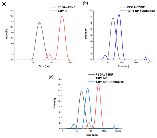 DLS size measurements of (a) PEGAuTSNPs and TJP1-PEGAuTSNPs, (b) TJP1-PEGAuTSNPs + anti-Spike, (c) superimposed graphs of (a,b).