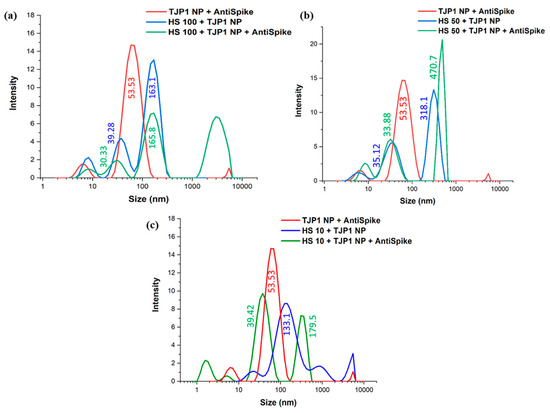 DLS measurements for TJP1-NP + anti-Spike and TJP1-NP within (a) 100%, (b) 50% and (c) 10% HS before and after addition of anti-Spike.