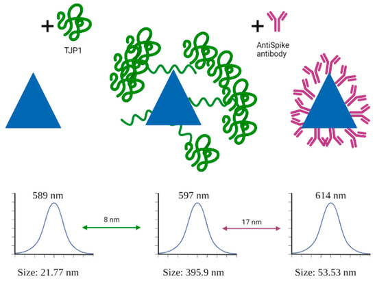 As mentioned before, anti-Spike seemed to show stronger affinity for the nanoplates, causing TJP1 to be replaced by the antibody on the nanoplates’ surface (Figure 7). DLS measurements for TJP1-PEGAuTSNPs could be attributed to TJP1 causing networking by itself. Since networking is not a close reaction to the PEGAuTSNP surface, it does not reflect in a large shift (8 nm) [25]. Nonetheless, upon anti-Spike addition, there was a reduction in size, possibly indicating the breakage of the TJP1 network on the nanoplates. The anti-Spike antibody seemed to show a stronger affinity for the nanoplates, causing the TJP1 protein to be replaced by the antibody on the nanoplates’ surface, reflected in a redshift. Nonetheless, the formed TJP1 network may be broken up, causing less protein molecules on the surface of the nanoplate, resulting in a DLS size reduction [25].