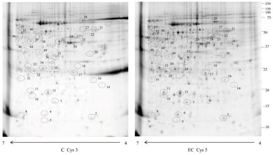 For 2D-DIGE experiments, 50 µg of phosphoproteins-enriched samples from EC patients and controls were labelled with 400 pmol of either Cy5 or Cy3. An equal sample quantity was pooled and labelled with Cy2 for the internal standard preparation. The reaction labelling was stopped by adding 1 µL of 10 mM lysine. After labelling, proteins were diluted in a rehydration buffer: 7 M urea, 2 M thiourea, 2% (w/v) CHAPS, 65 mM DTT, and 0.24% Bio-Lyte [,,,,,,,] (Bio-Rad Laboratories, Inc., Hercules, CA, USA). The 2-DE analysis was conducted as previously described []. ReadyStrip™ 4–7 18 cm immobilized pH gradient (IPG) (Bio-Rad Laboratories, Inc., Hercules, CA, USA) strips were used for 2-DE. Strips were rehydrated at 50 V for 12 h at 20 °C, and isoelectric focusing (IEF) was performed in a PROTEAN IEF Cell (Bio-Rad Laboratories, Inc., Hercules, CA, USA). Strips equilibration was achieved with two incubations: the first equilibration in a buffer (6 M urea, 2% SDS, 50 mM Tris-HCl (pH 8.8), 30% glycerol) for 5 min and a second equilibration step performed in 4% iodoacetamide for 10 min. The IPG strips were transferred to a 12% polyacrylamide gel (18.5 cm × 20 cm). Protein molecular weights were determined by Precision Plus Protein Prestained Standards (Bio-Rad Laboratories, Inc., Hercules, CA, USA) with a molecular weight range from 10 to 250 kDa. Gel analysis was executed by Proteomweaver 4.0 software (both from Bio-Rad Laboratories, Inc., Hercules, CA, USA) to normalize and quantify protein spots. Two experimental replicates per sample were performed. Polyacrylamide gel was scanned with a Molecular Imager PharosFX System (Bio-Rad Laboratories, Inc., Hercules, CA, USA).