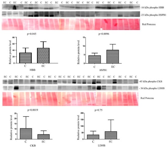 For the validation of the phosphoproteomic data, we selected three up-regulated phosphoproteins with fold change ≥ 4.5 (HBB, HPB1, LDHB) and one downregulated protein (CKB) with fold change ≤ 0.28 (Figure 2) (Figure S1). We used western blotting to validate the abundance of the phosphoproteins in 13 ECs vs. 13 CTRLs. A higher abundance was significant (Mann–Whitney sum-rank test p < 0.05) for HBB (p = 0.045) and HSPB1 (p = 0.0096), while LDHB showed an increase but not statistically noteworthy (p = 0.75). A decreased abundance was meaningful for CKB (p = 0.0019).