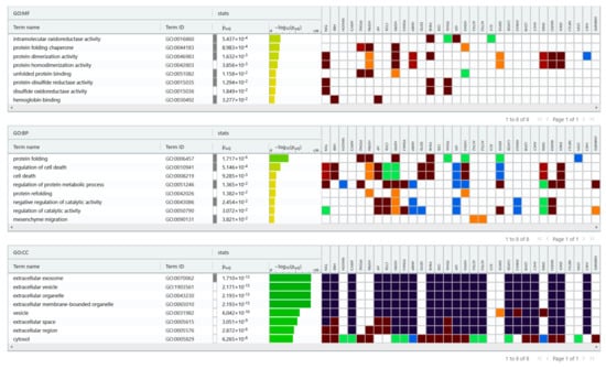 To understand the functional impact of differentially phosphorylated protein between ECs versus normal endometrium, we next performed bioinformatic enrichment using the gProfiler classification tool to categorize proteins based on their molecular function, biological processes, and cellular component (Figure 3). In terms of molecular function, proteins were ranked into intramolecular oxidoreductase activity, protein folding chaperone, protein dimerization activity, protein homodimerization activity, unfolded protein binding, protein-disulfide reductase activity, disulfide oxidoreductase activity, and haemoglobin binding. Regarding the biological processes, proteins were categorized into protein folding, cell death regulation, cell death, protein metabolic process regulation, protein refolding, catalytic activity negative regulation, catalytic activity regulation, and mesenchyme migration. Considering the cellular compartment, proteins were organized into extracellular exosome, extracellular vesicle, extracellular organelle, extracellular membrane-bounded organelle, vesicle, extracellular space, extracellular region, and cytosol. Regarding the pathway, Reactome’s tools indicate that these proteins are primarily involved in scavenging heme from plasma, Neutrophil degranulation, RNA Polymerase II Transcription Termination and AUF1 (hnRNP D0) binds and destabilizes mRNA.