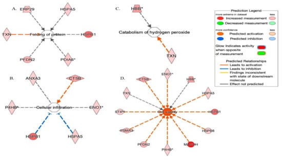 Network build-up from one of the most significant bio-functions: (A) Protein folding (Endoplasmic reticulum resident protein 29 (ERP), Endoplasmic reticulum chaperone BiP (HSPA5), Thioredoxin (TNX), Heat shock protein beta-1 (HSPB1), Prefoldin subunit 2 (PFDN2), Protein disulfide-isomerase A6 (PDIA6); (B) Cellular infiltration (Annexin A3 (ANXA3), HSPB1, HSPA5, 2-phospho-D-glycerate hydro-lyase (ENO1), Cathepsin B (CTSB), Protein disulfide-isomerase (P4HB); (C) Catabolism of hydrogen peroxide Thioredoxin (TNX), Hemoglobin subunit beta (HBB); (D) Cellular viability. ENO1, HBB, HSPA5, HSPB1, Heat shock protein beta-6 (HSPB6), Protein mago nashi homolog (MAGOH), P4HB, PFDN2, Proteasome subunit alpha type-3 (PSMA3), Stress-induced-phosphoprotein 1 (STIP), TXN, CTSB. * Isoform indication.