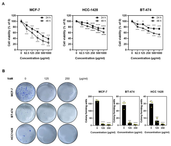 Inhibitory effects on the viability and proliferation of breast cancer cells. (A) The cells were treated with VaM for 24 or 48 h, and cell viability was assessed using the MTT assay. (B) Colony formation assay was performed to evaluate the inhibitory effect of VaM on cell proliferation. Cells treated with or without VaM were reseeded, and after 14 days, the colonies were stained and counted. The graph shows the quantification of stained colonies relative to that of the untreated group. The data were quantified based on an untreated group of each cell. * p < 0.05, ** p < 0.01, *** p < 0.001, and **** p < 0.0001 compared to the condition with zero treatment concentration. The results are presented in the bar chart as the mean ± SD of the three independent experiments. Yellow circles represent the results of three independent experiments.