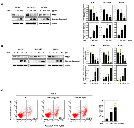 Apoptotic effect of VaM on breast cancer cells. Cells were treated with VaM (A) at various concentrations for 24 h and (B) 500 μg/mL at the indicated time points. The protein expression of Pro-PARP and cleaved-caspase 3, which are apoptosis markers, was confirmed by immunoblotting. The data were quantified and compared to those of the untreated groups. (C) Flow cytometry was used to analyze Annexin V/PI-stained cells. * p < 0.05, ** p < 0.01, *** p < 0.001, and **** p < 0.0001 compared to the condition with zero treatment concentration. The results are presented in the bar chart as the mean ± SD of the three independent experiments. Yellow circles represent the results of three independent experiments.