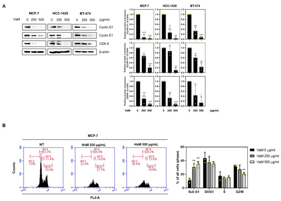 The cytotoxicity of VaM was measured using the 3-(4,5-dimethylthiazol-2-yl)-2,5-diphenyltetrazolium bromide (MTT) assay (Sigma Aldrich Co., St. Louis, MO, USA). MTT assay was performed as described previously [33]. Briefly, MCF-7 and BT-474 cells were seeded in 96-well plates (1 × 104 cells/well) and treated with different concentrations of VaM (0, 62.5, 125, 250, 500, and 1000 μg/mL) for 24 or 48 h. After 24 h, the cells were exposed to the MTT solution until formazan was formed, and the absorbance was measured at 570 nm using a microplate reader (Bio-Rad, Hercules, CA, USA).