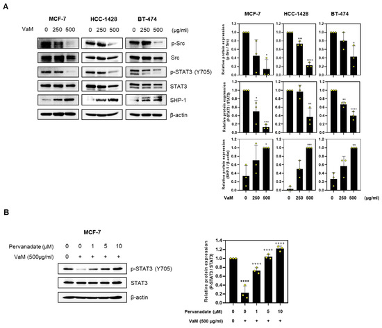 Modulation of Src and STAT3 phosphorylation in breast cancer cells by VaM. (A) The protein expression of p-Src, Src, p-STAT3 (Y705), STAT3 (Y705), and SHP-1 was confirmed by immunoblotting. The data were quantified and compared to that of the untreated groups. (B) MCF-7 cells pre-treated with pervanadate were treated with VaM, and the protein expression levels of p-STAT3 and STAT3 were examined by immunoblotting. * p < 0.05, ** p < 0.01, *** p < 0.001, **** p < 0.0001 compared to the no treatment concentration group. ++++ p < 0.0001 compared to VaM (500 μg/mL) group. The results are presented in the bar chart as the mean ± SD of the three independent experiments. Yellow circles represent the results of three independent experiments.