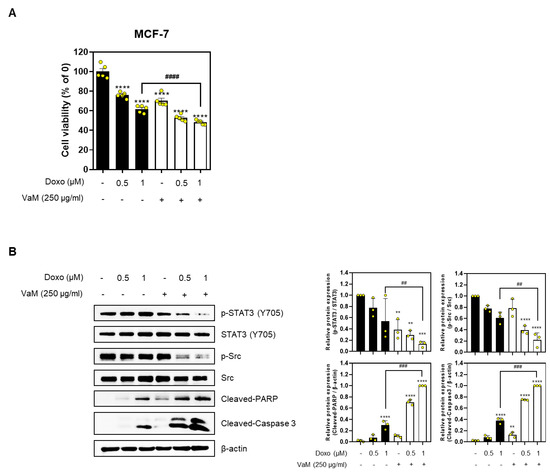 Potential combined effects of doxorubicin and VaM in breast cancer cells. Doxo was treated with or without VaM (250 μg/mL) for 24 h in MCF-7 cells. (A) Cell viability was determined using MTT assay. (B) The protein expression of p-STAT3 (Y705), STAT3, p-Src, Src, cleaved-PARP, and cleaved-caspase 3 was confirmed by immunoblotting. ** p < 0.01, *** p < 0.001, **** p < 0.0001 compared to the no treatment concentration group. ## p < 0.01, ### p < 0.001, and #### p < 0.0001 compared to only Doxo (1 μM) group. The results are presented in the bar chart as the mean ± SD of the three independent experiments. Yellow circles represent the results of three independent experiments.
