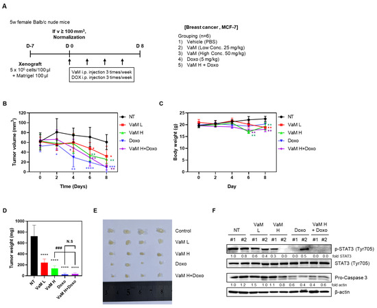 Effects of VaM on breast cancer cell growth in a xenograft mouse model. (A) Schematic representation of the experimental methods described in the Materials and Methods section. MCF-7 cells (5 × 106 cells/mouse) were mixed with Matrigel (1:1, v/v) and injected subcutaneously. Mice were randomly assigned to 6 groups and intraperitoneally administered 100 μL of PBS or each drug (25 and 50 mg/kg of VaM and 20 mg/kg of doxorubicin) 3 times a week for 14 days. The tumor volume was measured, and the mice were euthanized at the end of the treatment. (B) Changes in body weight and (C) tumor volume were monitored for 2 weeks after drug administration. (D) Representative photographs of harvested tumors from each treatment group. (E) Tumor weight was measured. (F) Immunoblotting analysis of tumor tissue lysates for p-STAT3, STAT3, cleaved-PARP, and pro-caspase 3 protein expression levels. * p < 0.05, ** p < 0.01, *** p < 0.001, **** p < 0.0001 compared to the no treatment concentration group. ### p < 0.001 compared to VaM H group. N.S means no significant difference.