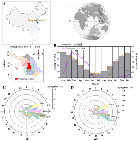 The seasonal changes in the reproductive activity of female Yangzhou geese under the natural photoperiod. (A) Location map of the experimental site, labeled as the red region. Latitude was taken from Google Earth (www.googleearth.com, accessed on 5 January 2021). Colors indicate the cities: red represents the area of sample collection (Yangzhou, China). (B) Annual changes in the natural photoperiod (bar chart) and laying rate (solid line) are shown during the entire experimental period. SE, Spring equinox (20 March 2020); SS, summer solstice (21 June 2020); AE, autumn equinox (22 September 2020); WS, winter solstice (21 December 2020). (C,D) The observations of the egg-laying time at the SE and WE. Outer circles represent the 24 h day, and vertical coordinates indicate the laying rate. Colors correspond to time points.