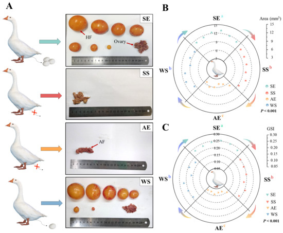 Effect of seasonal photoperiods on the gonad development. (A) Gross anatomical changes in the ovarian and follicular development at the SE, SS, AE, and WS. HF, hierarchical follicles; AF, atretic follicles. Cross symbol (×) indicates stop laying eggs. (B) Ovarian area (SE, SEM = 0.288; SS, SEM = 0.179; AE, SEM = 0.317; WS, SEM = 0.382). (C) Gonad index (GSI) (SE, SEM = 0.006; SS, SEM = 0.004; AE, SEM = 0.005; WS, SEM = 0.007). Different letters indicate statistically significant differences among groups (p < 0.05), analyzed using one-way ANOVA followed by Tukey’s multiple comparisons test (N = 6 per point). a,b,c Different letters represent significant differences.