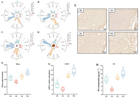 Mtnrs showed a wide tissue distribution, being found in the pineal gland, hypothalamus, pituitary gland, and ovary (Figure 4). Mel-1a had an obvious seasonal fluctuation in the pineal gland and hypothalamus, and the expression level increase rapidly after the SS, reaching a higher expression at the AE (F = 39.577, p < 0.001; F = 49.654, p < 0.001, respectively) (Figure 4A,B). The expression levels of three Mtnrs all showed at least threefold changes at the AE compared to the values at the SS in the pituitary gland (F = 16.332, p < 0.001, Figure 4C). Among them, Mel-1b had a higher expression compared to other Mtnrs at the WS (p < 0.001). In the ovary, stable expressions of Mel-1a and Mel-1b were consistently at a lower level during the different seasons, while Mel-1c showed a 2.5-fold increase from the SS to AE (F = 85.114, p < 0.001, Figure 4D). Moreover, immunohistochemistry was used to assess the expression of Mtnr in the pineal gland. As shown in Figure 4E, Mtnrs were widely expressed in the pineal organ, with higher levels observed near the connective tissue capsule. Likewise, there were also seasonal variations in Mtnr expression levels (Figure 4F). The expression level of Mtnr decreased from the WS to SE, while it increased significantly at the AE with a shortened photoperiod compared to the SS (F = 28.199, p < 0.001). Lastly, there were consistent seasonal fluctuations between the expression levels of the Aanat gene and the contents of melatonin (MT). The expression of Aanat increased significantly with a shortening of the photoperiod from the SS to AE (F = 186.361, p < 0.001, Figure 4G). Serum melatonin levels were significantly elevated under a shorter photoperiod, reaching a maximum increase approaching threefold at the AE compared to the SS (F = 45.996, p < 0.001, Figure 4H).