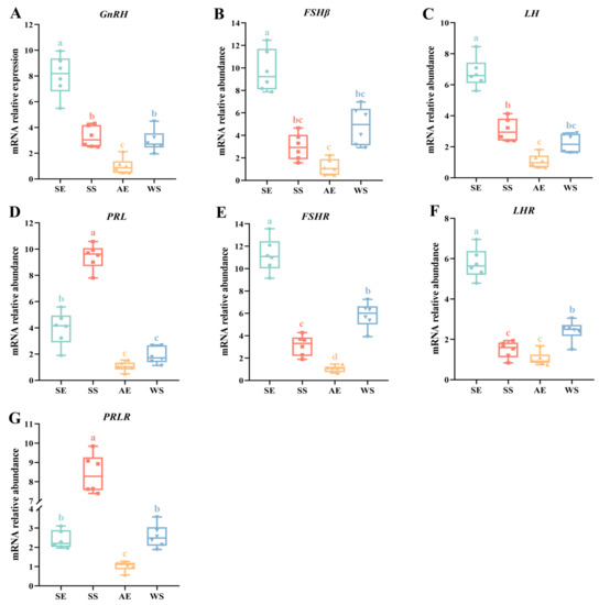 The results for seasonal changes in reproduction-related genes are shown in Figure 5. GnRH showed a highest expression level at the SE, and then its expression decreased steadily from the SS to AE with a shortened photoperiod (F = 50.299, p < 0.001, Figure 5A). In the pituitary gland, the expression levels of FSHβ and LH gradually decreased with longer photoperiods, before increasing again at the WS (Figure 5B,C). Consistently, the results of FSHR and LHR also showed similar seasonal oscillations and were expressed at the highest levels at the SE (F = 103.388, p < 0.001; F = 99.268, p < 0.001, respectively) (Figure 5E,F). On the contrary, the expression of PRL in the pituitary gland reached a maximum peak at the SS and showed an almost fourfold increase compared to the AE and WS (F = 110.401, p < 0.001, Figure 5D). Furthermore, the expression of PRLR in the ovary demonstrated a similar trend, with the lowest level at the AE and the highest at the SS (F = 156.698, p < 0.001, Figure 5G).