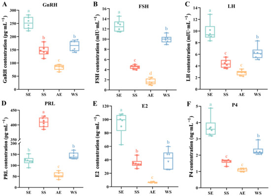 The levels of reproductive hormone secretion through the different seasons are shown in Figure 6. Among them, the concentrations of GnRH, FSH, LH, E2, and P4 showed similar seasonal oscillation patterns in a short photoperiod and long photoperiod. At the SE, as the photoperiod lengthened, the concentration of these hormones in serum significantly increased compared to the WS, while the lowest levels were found at the AE (F = 75.921, p < 0.001; F = 240.707, p < 0.001; F = 49.034, p < 0.001; F = 81.526, p < 0.001; F = 59.137, p < 0.001, respectively). Although the result of PRL also showed obvious fluctuations over the different seasons, the highest values corresponded to the SS (F = 506.974, p < 0.001, Figure 6D).