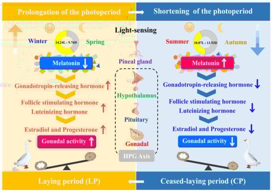 The photoperiod is the main environmental factor governing seasonal changes in female Yangzhou geese, and it is directly involved in the regulation of seasonal reproduction. To uncover the regulatory mechanisms that synchronize photoperiodic cues and seasonal reproduction, we reported the anatomy, ultrastructure, and secretory activity characterizing the pineal gland under different photoperiod regimes, with a particular focus on regulation by the hypothalamus–pituitary–gonadal (HPG) axis. In the present study, the pineal gland, in response to the seasonal photoperiod, drove the alternation between the laying period (LP) and ceased-laying period (CP). The seasonal secretion of melatonin reflected changes in the photoperiod, and we thereby provided insight into neuroendocrine control of reproduction via an internal molecular representation of external photoperiod changes (Figure 7).