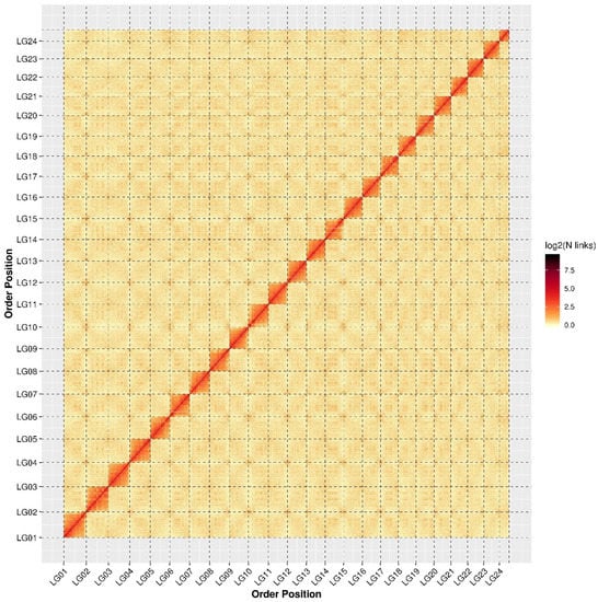 Heatmap of interaction of contigs for giant grouper genome assemblies. A deeper color indicates a higher interaction level of contigs. Red indicates a high interaction level and white indicates a low interaction level.
