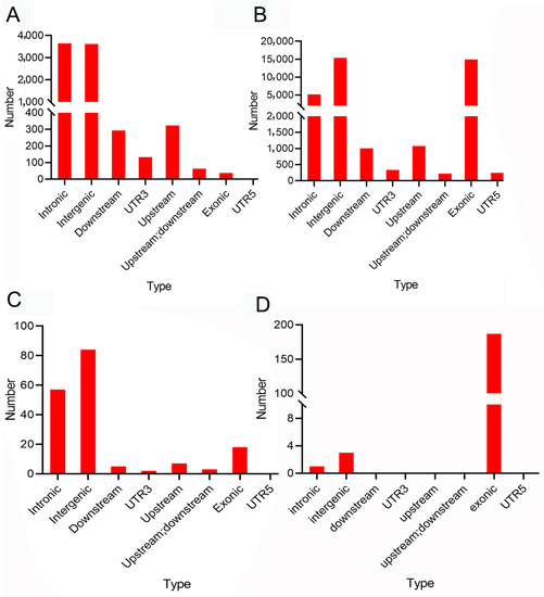 Based on annotations using Annovar software, deletions and insertions were mainly located in introns and intergenic regions (3648 and 3619, respectively). A total of 37 deletions and insertions were located in exons. Repeat mutations were mainly located in intergenic regions and exons (15,382 and 14,913, respectively). Tandem expansions and contractions were mainly located in intergenic regions (Figure 2).