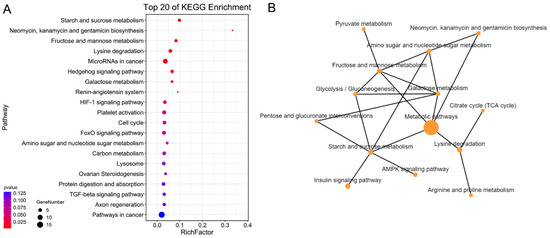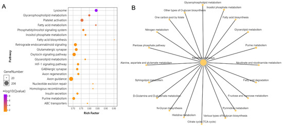 KEGG enrichment of protein-coding genes involved in highly differentiated regions between brown-marbled grouper and giant grouper genomes. (A) Gradient of KEGG enrichment. The sizes of bubbles indicate the numbers of genes, purple indicates a high enrichment level and orange indicates a low enrichment level. (B) Metabolism pathway network. The size of the spot indicates the gene’s number of pathways.