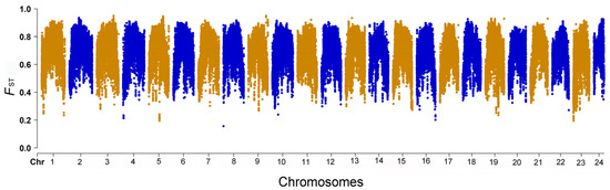 Manhattan plot of FST values of SNPs between giant grouper and brown-marbled grouper genomes.