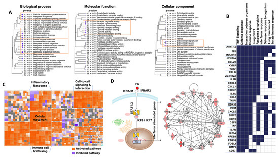 Analysis of GO terms enriched in the unique bulk RNA-seq signature of the ALI model at day 1 post-infection by SARS-CoV-2. (A) Pathway enrichment analyses were performed with human gene names. The size of the blue dots corresponds to the enrichment (FDR), and bigger dots indicate more significant p-values. The biological process, molecular function and cellular component categories revealed the high enrichment of immune response and cytokine/chemokine activities upon SARS-CoV-2 infection. (B) GSEA performed using the unique bulk RNA-seq signature upon SARS-CoV-2 infection. The heat map shows the (clustered) genes in the leading-edge subsets and the dynamic expression of genes involved in immune response, interferon response, defense response, TNF signaling and response to cytokines. (C) Enrichment heat map (IPA) showing the dynamic activity of canonical pathways after SARS-CoV-2 infection. Each colored rectangle is a biological function, and the color range indicates its activation state (orange for an activated pathway with Z-score > 2 and blue for an inhibited pathway with Z-score < −2). The pathways were classified into different types according to the IPA database. (D) The network shows the interactions of interferon (IFN)-stimulated genes. Nodes shaded in pink represent protein-coding genes that are upregulated in the ALI model upon SARS-CoV-2 infection. Labels in nodes and edges (lines) illustrate the nature of the relationship between genes and their functions. A dotted line represents an indirect interaction and a solid line a direct interaction. IPA, Ingenuity Pathway Analysis. GO, Gene Ontology.