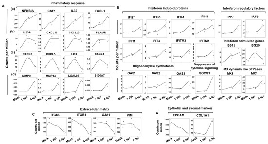 Dynamic gene expression changes in the iALI model upon SARS-CoV-2 infection. Expression levels of (A) inflammatory cytokines/chemokines, including (a) genes that were upregulated early and the expression of which gradually increased upon SARS-CoV-2 infection, from 1 to 4 dpi; (b) genes that were upregulated early, the expression of which remained constant between 1 and 4 dpi; (c) genes that were upregulated specifically at 1 dpi and were then downregulated at 4 dpi; and (d) genes that became upregulated at 4 dpi. Expression of genes implicated in the (B) interferon response, (C) extracellular matrix and (D) epithelial/stromal gene upon infection. Normalized expression levels (counts per million reads) were quantified via RNA-seq using data from [14] (human iPSC-derived AT2 cells infected or not with SARS-CoV-2).