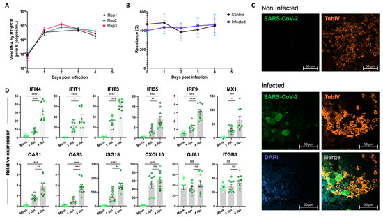 Validation of SARS-CoV-2 infection in the iALI model. (A) iALI cultures were infected with SARS-CoV-2 Delta with MOI (multiplicity of cellular infection) = 0.05. Then, viral RNA was extracted from apical wash samples, and viral gene E was quantified via RT-qPCR (copies/mL). Data are from three independent experiments (Replicate-1, replicate-2, replicate-3) using three different iALI cultures. The standard deviation shows the result variability. (B) Transepithelial electric resistance (TEER) measurements of infected iALI cultures and controls. (C) Non-infected and SARS-CoV-2 Delta (MOI = 0.05)-infected iALI cultures were stained with anti-SARS-CoV-2 M protein (viral membrane protein, green), anti-α-tubulin (ciliated cell marker, orange) and anti-P63 (basal cell marker, red) antibodies. Nuclei were counterstained with DAPI (blue). SARS-CoV-2 was identified on the motile cilia. Scale bar: 20 µm. (D) RT-qPCR analysis of the expression of genes encoding inflammatory and interferon-related factors in iALI cultures infected with SARS-CoV-2 (MOI 0.05) at 1 dpi and 4 dpi. Data are the mean ± SEM of three independent experiments with three technical replicates/each (9 samples); * p < 0.05, ** p < 0.01, *** p < 0.001, **** p < 0.0001, ns: not significant (Student’s t test). MOI: multiplicity of cellular infection.