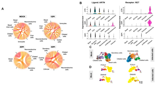 ALI cultures include different cell types connected by tight and adherens junctions. Communication between epithelial cells occurs through the release of a variety of small molecules, including cytokines and chemokines. To investigate the impact of SARS-CoV-2 infection on ligand/receptor interaction between the different airway cell types, scRNA-seq data from HBEC ALI cultures, infected or not with SARS-CoV-2 (MOI 0.01), were analyzed using the SingleCellSignalR method. Comparison of the summary chord diagram indicated a decrease in the number of paracrine interactions between the main epithelial cell types two dpi (Figure 5A), which strongly suggests an impact of SARS-CoV2 infection on intercellular communications. For instance, expression of receptor tyrosine kinase (RET) and its ligand artemin (ARTN), one of the most pre-eminent interacting pairs between neuroendocrine cells and other epithelial cells, was strongly decreased at 3 dpi (Figure 5B). This suggests that neuroendocrine cells are particularly sensitive to environmental stimuli (e.g., viral infection) and act as a rheostat to orchestrate ALI culture responses.