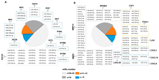 GenGo Metacore software was then used to identify miRNAs that regulate the epithelial cell response genes after SARS-CoV-2 infection in the ALI and iALI models (i.e., potential antiviral targets). This analysis identified 167 miRNAs that regulate the key epithelial cell intrinsic genes deregulated upon viral infection (Figure 3A,B). Among these miRNAs, 44 were regulators of interferon response genes and 123 were regulated inflammatory response genes (complete list of miRNAs in Supplementary Table S6). More than 54% of the interferon gene targets were regulated by more than one miRNA. For instance, SOCS3 and MX2 were targeted by 24 and 5 miRNAs, respectively (Figure 6A). The inflammatory genes regulated by the highest number of miRNAs were MMP9 (n = 29 miRNAs), NFKBIA (n = 19), MMP13 (n = 19), CSF1 (n = 12), FOSL1 (n = 11) and LOX (n = 11) (Figure 6B). MIR34a was identified as a potential regulator of MMP9, NFKBIA, FOSL1 and CXCL10, whereas MIR203 and MIR19 were common regulators of NFKBIA, MMP13 and SOCS3. MIR138-5p and MIR-326-3p are validated regulators of ISG15 and ISG20. MIR650, MIR541-3p and MIR302d-3p regulated several interferon-stimulated genes, including MX1, MX2, IRF7 and IRF9. CSF1 and LOX were targets of MIR130a and MIR29, respectively. These miRNAs can attenuate the inflammatory response and inhibit key coagulation cascade factors, thus preventing inflammatory epithelium damage. Moreover, 45 miRNAs were differentially expressed between SARS-CoV-2-infected and control lung-derived epithelial cells from an independent study (GSE148729) [29]. Among them, 17 miRNAs were significantly upregulated after 24 h of infection, and 28 were downregulated. These microRNAs differentially expressed in lung epithelial cells following SARS-CoV-2 infection were compared to the list of 129 microRNAs identified with GenGo Metacore using Venn diagrams. Among the 17 upregulated miRNAs (published datasets), 5 modulated the epithelial response to SARS-CoV-2 infection in both ALI and iALI models (MIR155-5p, MIR483-3p, MIR483-5p, MIR125b-5p and MIR4284). Conversely, downregulated miRNAs were not present on our list.