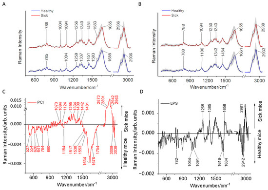 Mean Raman spectra, along with the standard deviation of T-lymphocytes isolated from the spleens of (A) mice with sepsis due to peritoneal contamination infection (red) and the sham (blue) and (B) endotoxemic mice (red) and the sham (blue) mice. Raman difference spectra are generated by subtracting. (C,D) Raman difference spectra generated by subtracting the Raman spectra of T-lymphocytes isolated from the spleens of sham mice from (C) mice with sepsis due to peritoneal contamination infection and (D) endotoxemic mice.