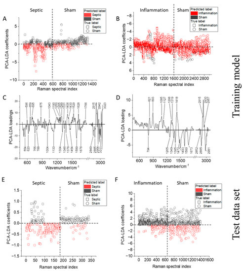 Optimized Raman model to differentiate T-lymphocytes isolated from the spleens of (A) septic (PCI mice) 24 h post-infection and (B) mice with inflammation (endotoxemia) 24 h post-insult, with PCA-LDA loading 1 obtained for (C) the PCI and (D) LPS models. Cross-validation using the test data set is shown for (E) the PCI and (F) LPS models. The index in (A,B,E,F) refers to the number of Raman spectra used for building the classification model. The true labels are presented with square (septic) and circle (sham) legends, and the colors of the legends show the classification/prediction results: red (septic) and black (sham).