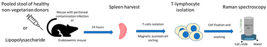 A schematic diagram of the sample preparation is shown in Figure 3. The animals were sacrificed 24 h post-infection, and the spleen organ was harvested. The spleens were placed on a 70 mm cell strainer and gently squashed using a plunger. The cells were then washed with PBS (Biochrome, Berlin, Germany) that was supplemented with 0.5% BSA (PAA laboratories, Coelbe, Germany) and 2 mM EDTA (AppliChem, Darmstadt, Germany). Next, erythrocyte lysis buffer (10 mmol/L KHCO3; 150 mmol/L NH4Cl; 0.1 mmol/L EDTA) was used to remove the red blood cell contamination of the sample, and the cells were washed again. The T-cell subsets were purified using automated negative magnetic sorting (autoMACS Pro system; Miltenyi Biotech, Bergisch Gladbach, Germany) using standard isolation kit protocols (Miltenyi Biotech, Bergisch Gladbach, Germany), as previously described [29]. For the Raman measurements, the separated splenocytes were fixed with 4% formaldehyde for 10 min at room temperature. The cells were then washed with 1 mL PBS by centrifugation (600 RCF/2000 rpm for 5 min), suspended in 500 uL PBS, and stored at 4 °C until measured. All the cells were measured within 6 h after preparation.